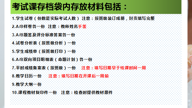 会上,刘波老师详细讲解了考务工作涉及的五个方面:试卷命题,阅卷标准,成绩录入规范,理论课存档材料要求和监考规范。结合几个学期学院试卷检查和预评估专家总结的问题逐一进行说明。提高了教师对考务工作的全面认识和理解。