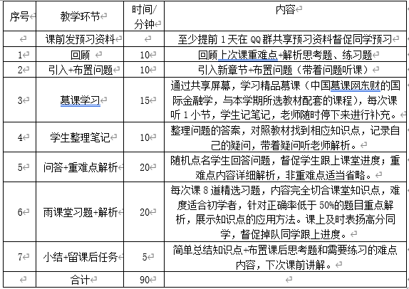 本门课程由课程组决定选用东北财经版的《国际金融学》教材,刚好中国慕课网有对应的整套课程,但是教材与在线精品课照比我们的大纲少了三章的内容,课程组统一进行直播授课并录制屏幕制成教学资源。